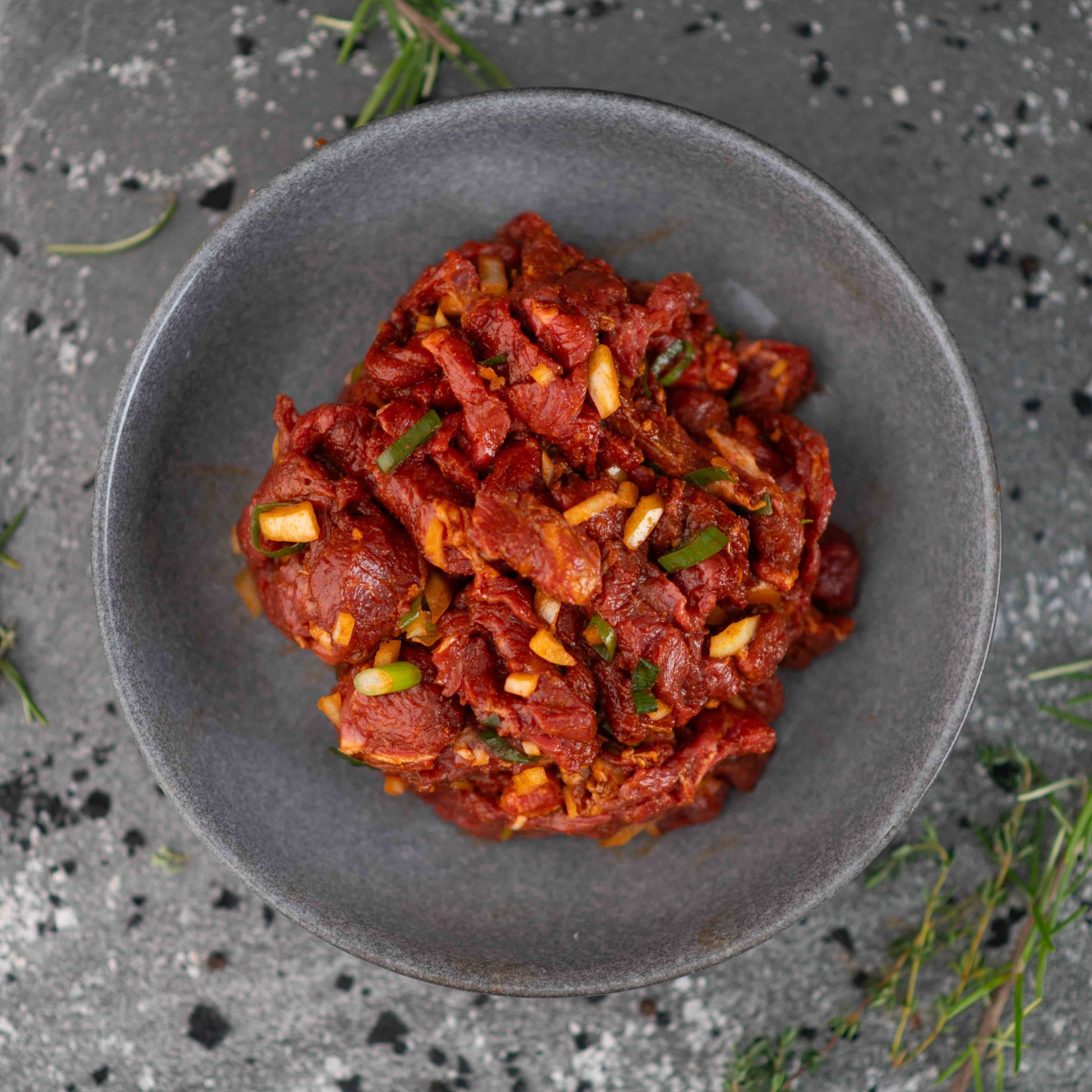 將瘦羊肉條與洋蔥丁和蔥一起用伊羅斯 (Yiros) 風格醃製。 非常適合放入 Yiros 的捲餅中或與米飯一起食用。